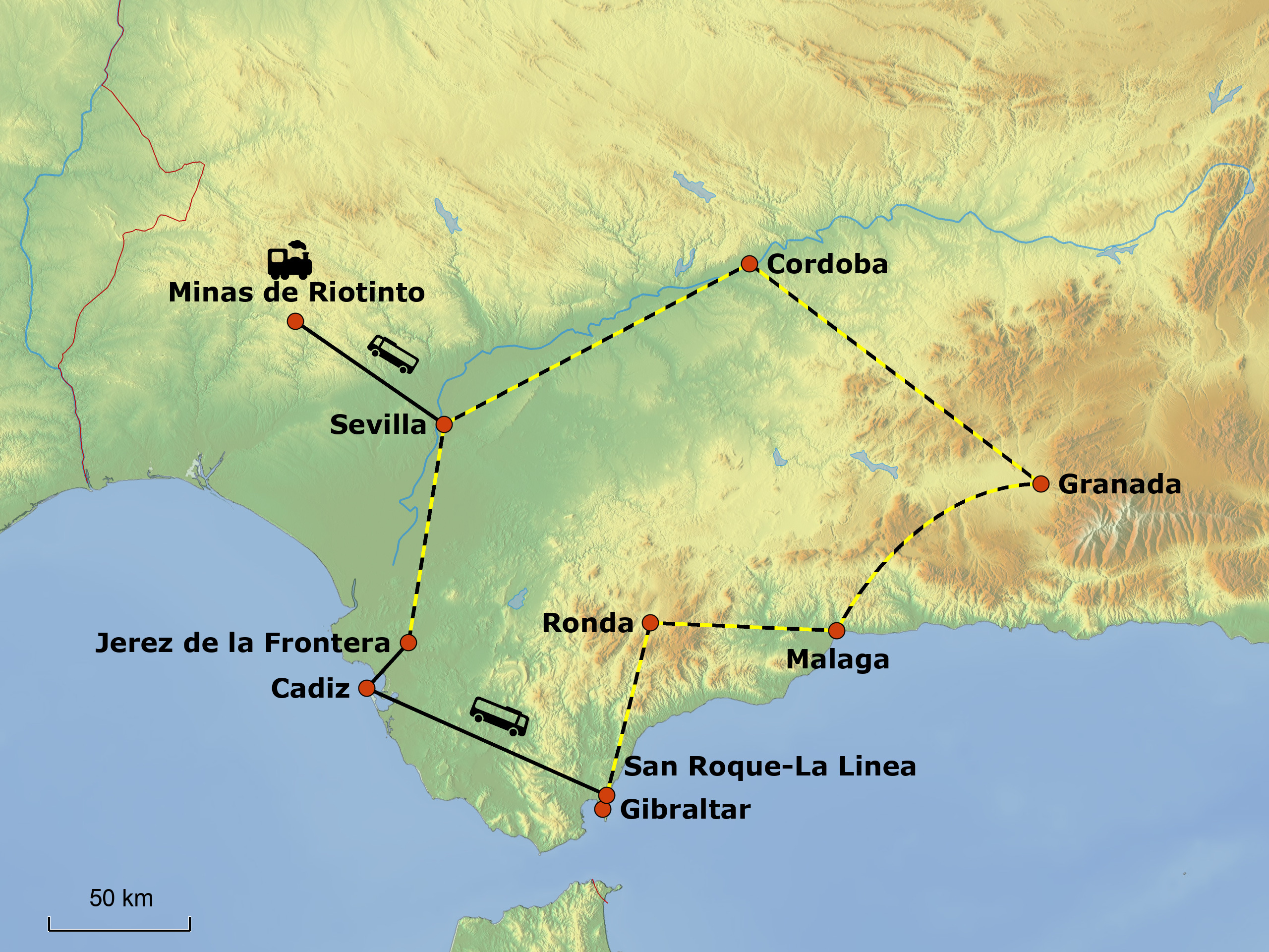 - 8x Übernachtung mit Frühstück in 4-Sterne-Hotels (Landeskategorie): 3x in Sevilla, je 1x La Linea bei Gibraltar, Ronda, Málaga, Granada und Córdoba